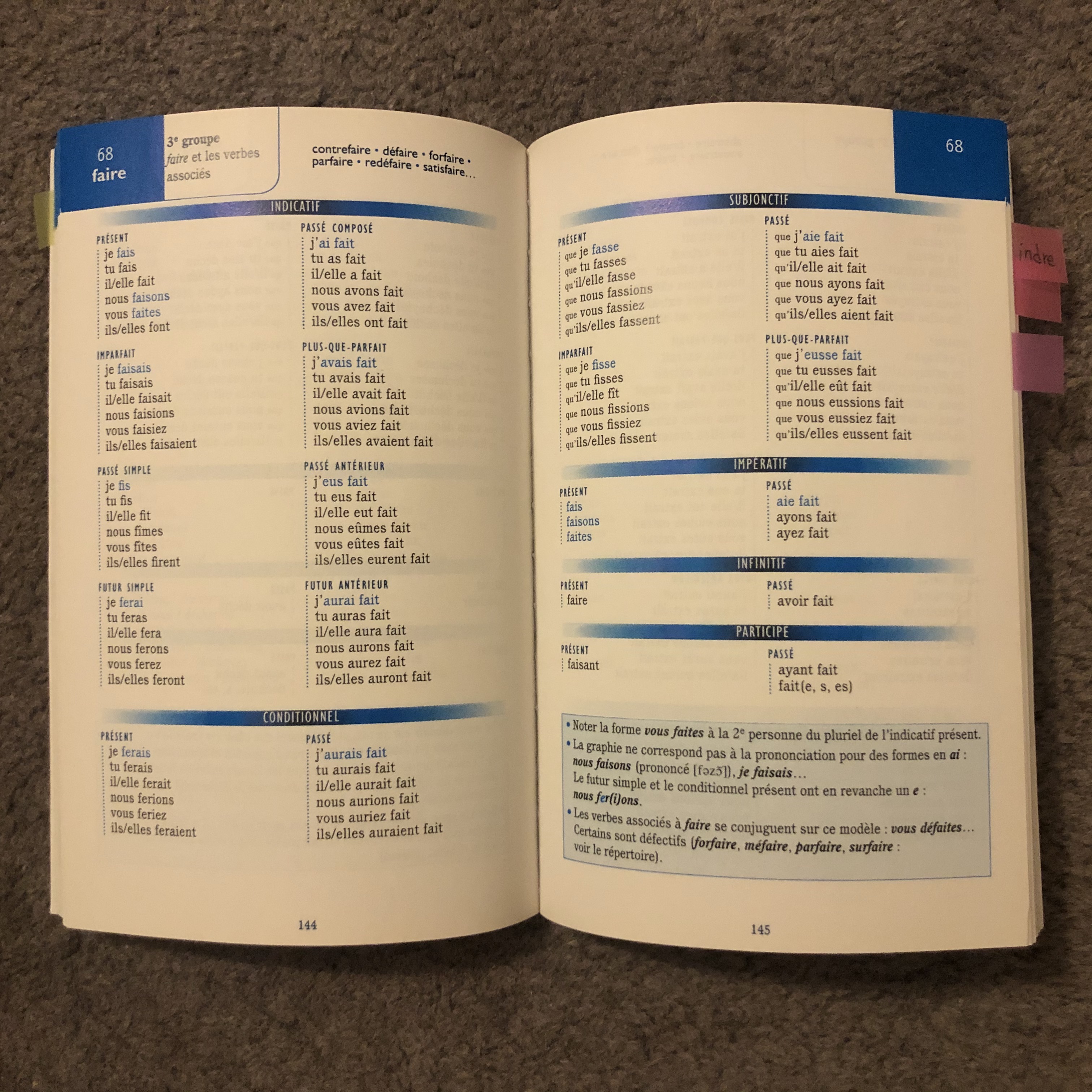 3군 불규칙 동사 Faire 페이지를 예시로 들고 와 보았다. 가장 상단에 현재 그룹의 대표 동사와 그의 친구들이 적혀있고, 2페이지에 걸쳐 직설법, 조건법, 접속법, 현재분사 등 아주 상세하게 나와있다.